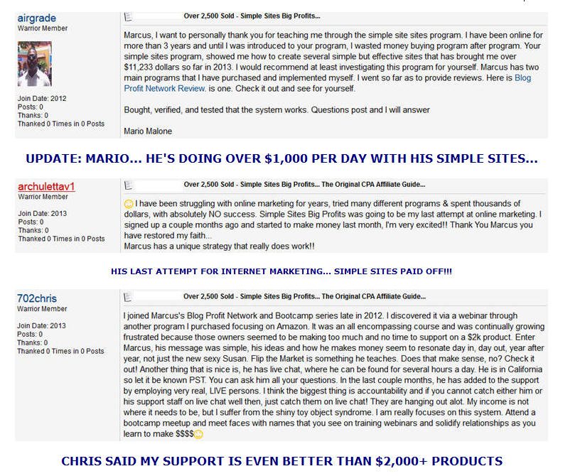 - Making Money Online Since July, 2000 Who Is Marcus | Contact Marcus | BLOG | DMCA | Privacy Policy Blogprofitnetwork.com and the products and services offered on Blogprofitnetwork.com are not associated, affiliated, endorsed, or sponsored by WordPress, nor have they been reviewed tested or certified by WordPress.Disclaimer: Simple Sites Big Profits And the Simple Sites Big Profits Website is a guide showing you how I have used the simple sites big profits method to generate an income online for over 15 years now. While I cannot guarantee that you will make money following these steps I will teach you everything I can and try to help you personally. As with any business there is always a possibility you may even lose money. The Sites And Examples Referenced In This Website And In The Simple Sites Program May Not Be Producing The Same Results, May Not Be Making Money, Or Even Be Running At The time you read this. |